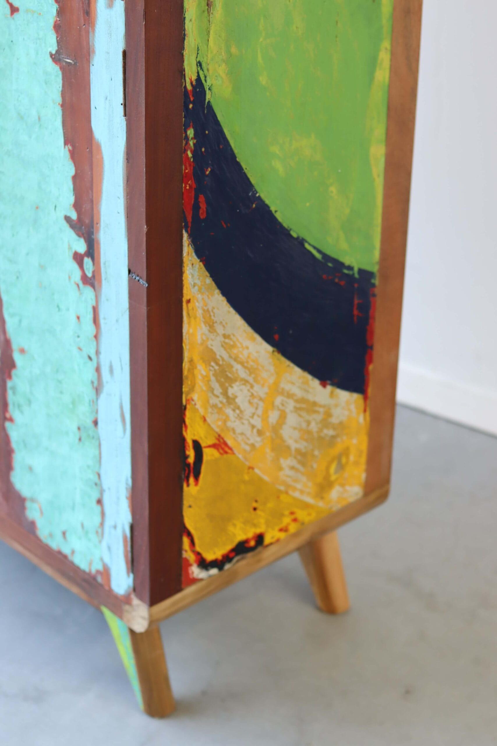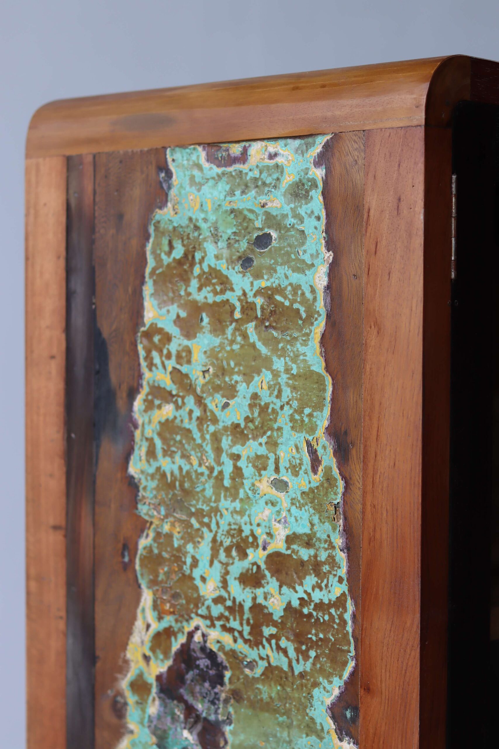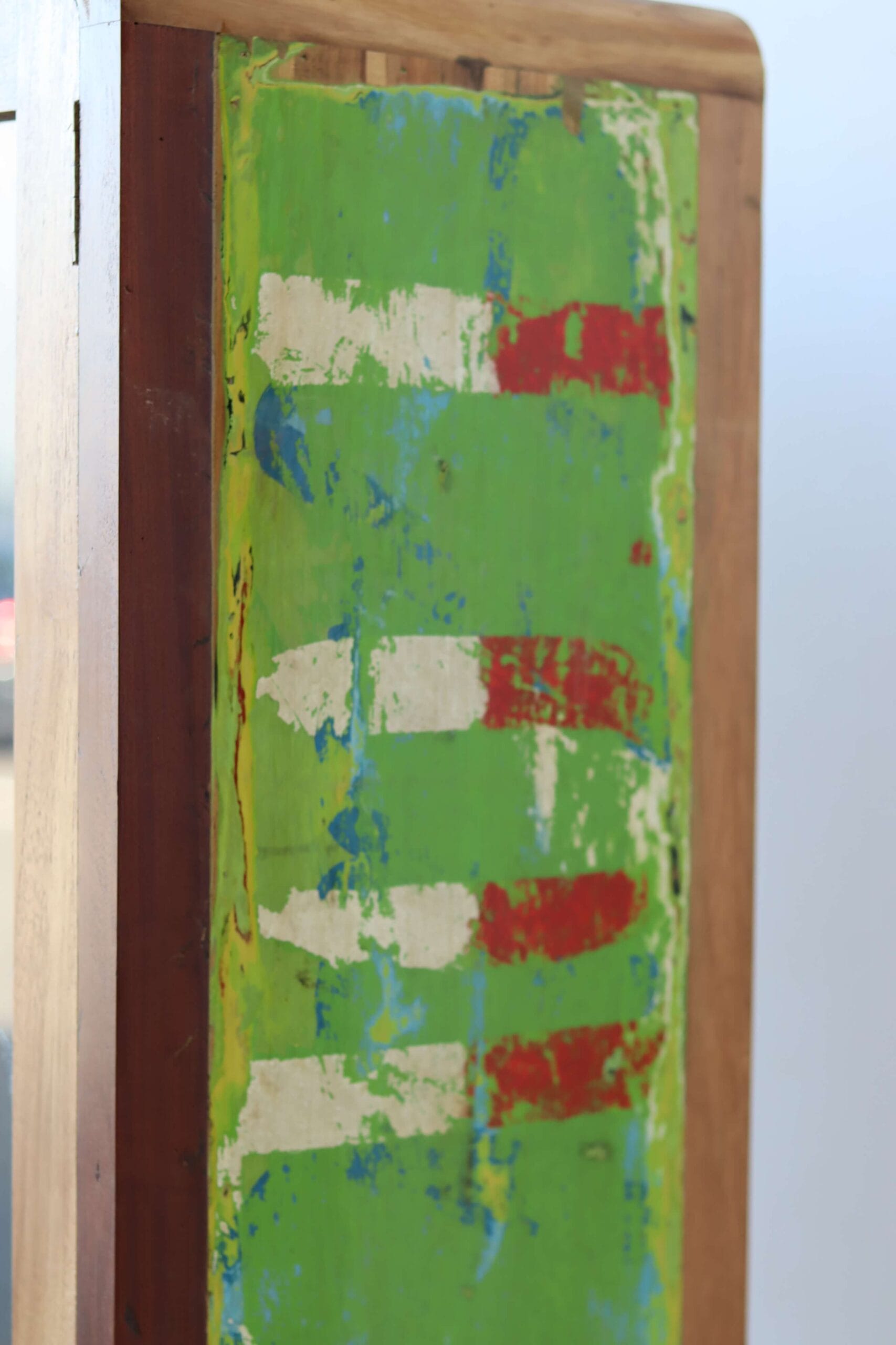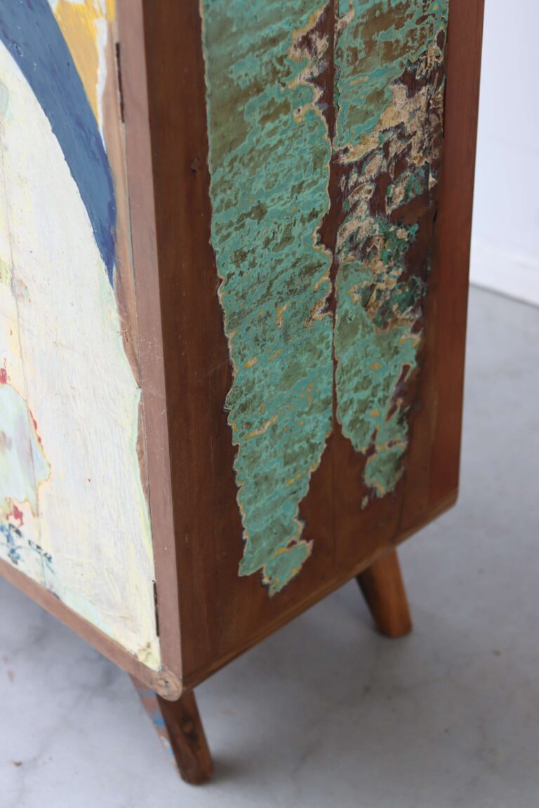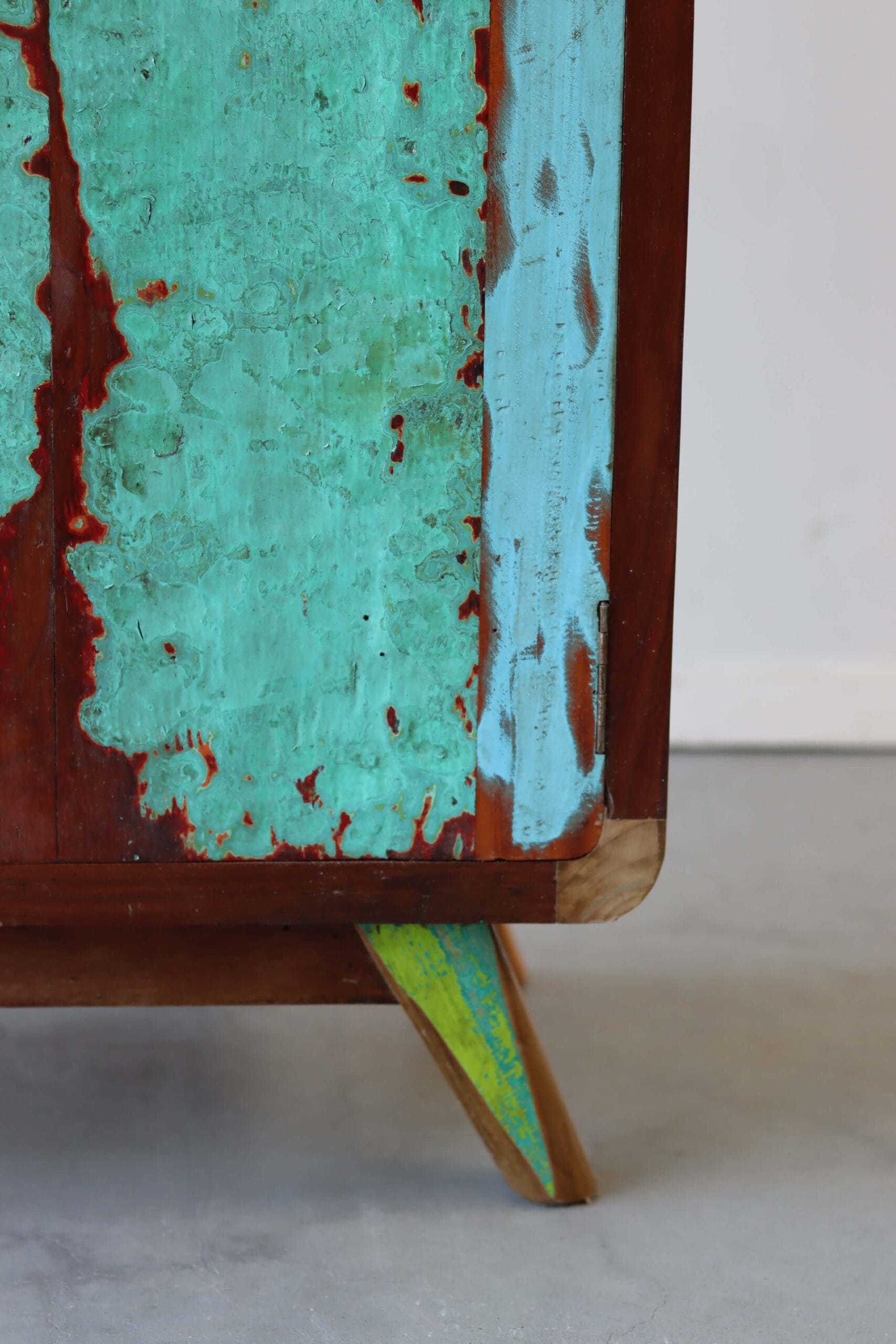 Waar Nyepi een dag van stilte is, spreekt deze kast juist in kleuren. Het hout komt van oude vissersbootjes, verzameld langs de Indonesische kusten. Elk stuk hout heeft zijn eigen tint en textuur. De verweerde verf en de natuurlijke veroudering maken elke kast uniek. Zo ontstaat een levendig contrast: een kast vernoemd naar de meest serene dag van Bali, maar met een uitstraling vol karakter en energie.
