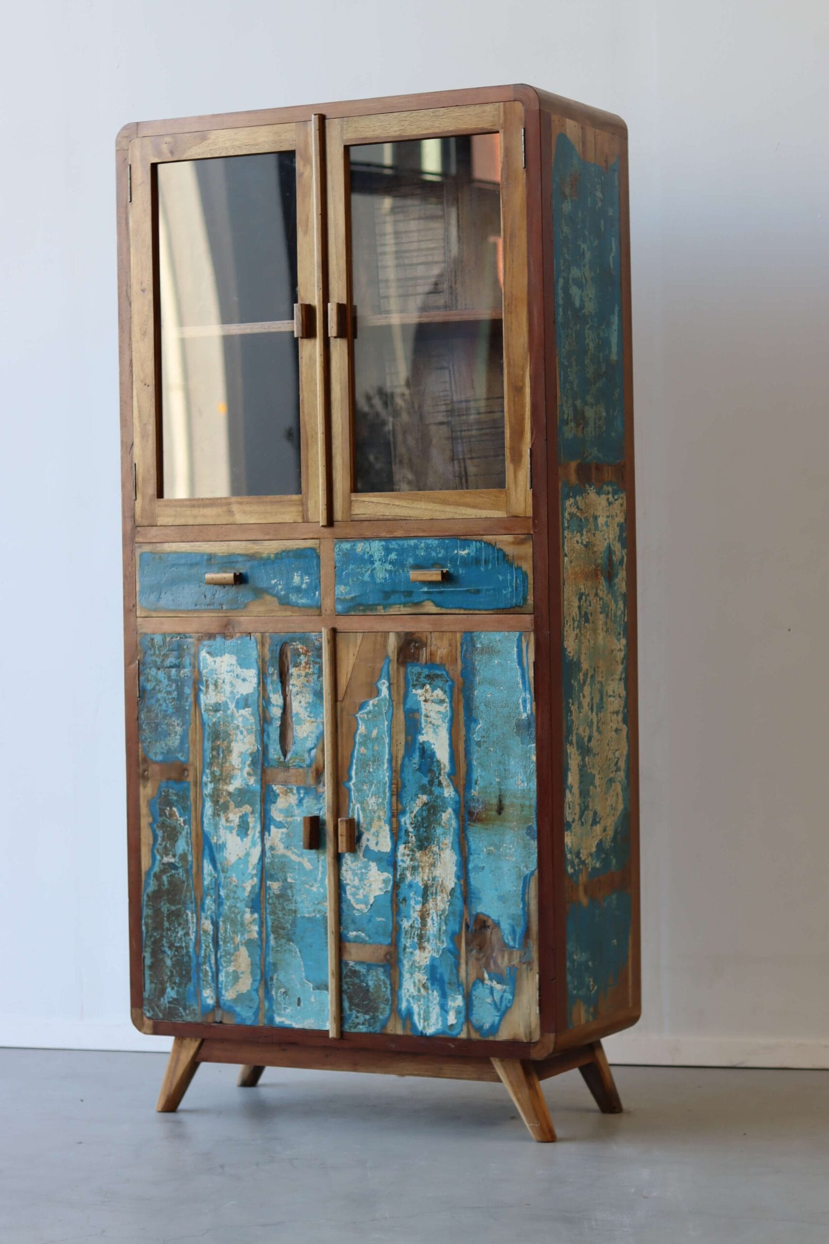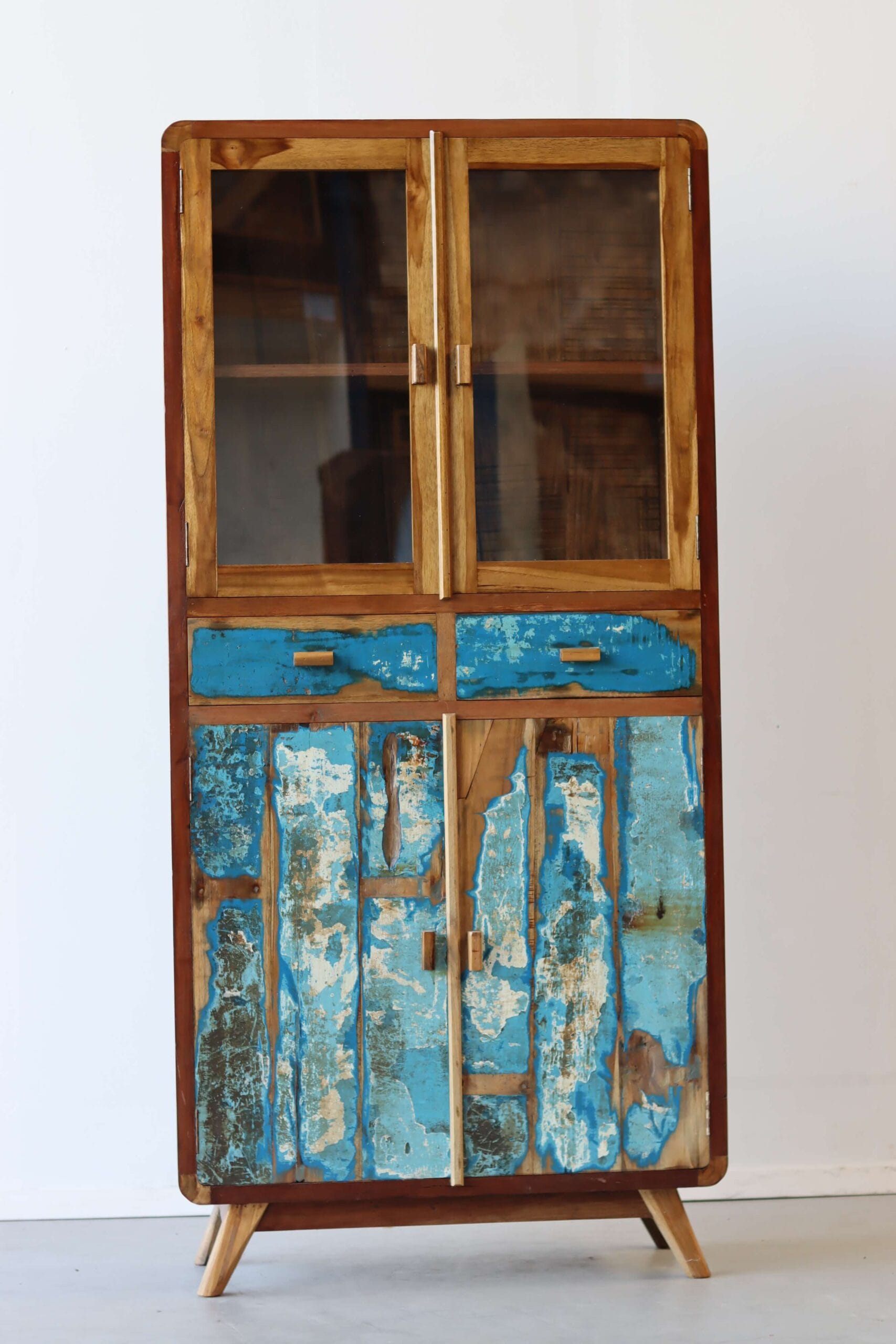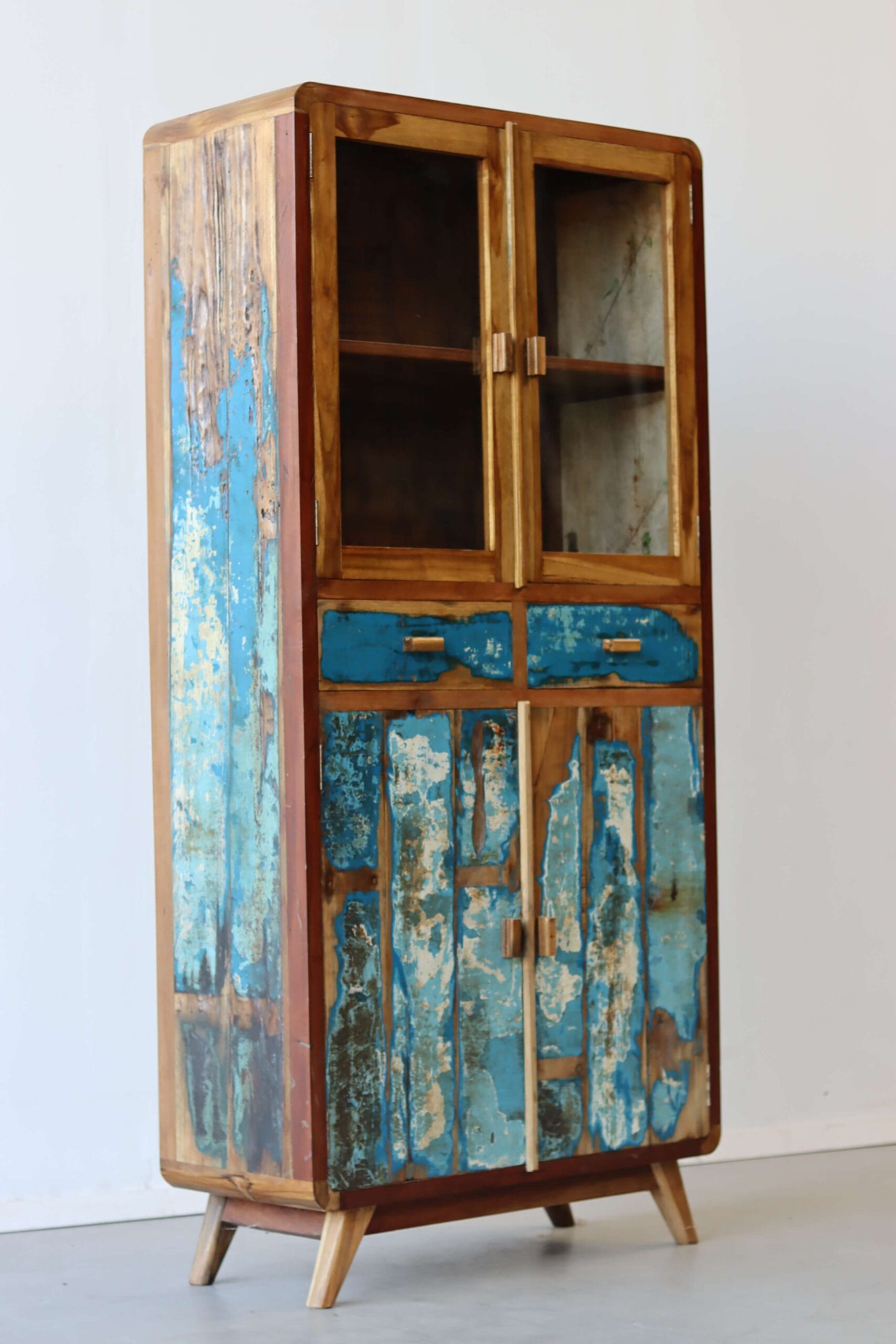 De originele verfresten van de bootjes maken elke kast uniek. Het hout is door de jaren gevormd door zon, zout en zee. Geen twee kasten zijn hetzelfde. Dit maakt de vitrinekast Canggu een echte blikvanger. Of je nu een industriële loft, een bohemian stadspand of een strandhuisgevoel wilt creëren, deze kast past overal.