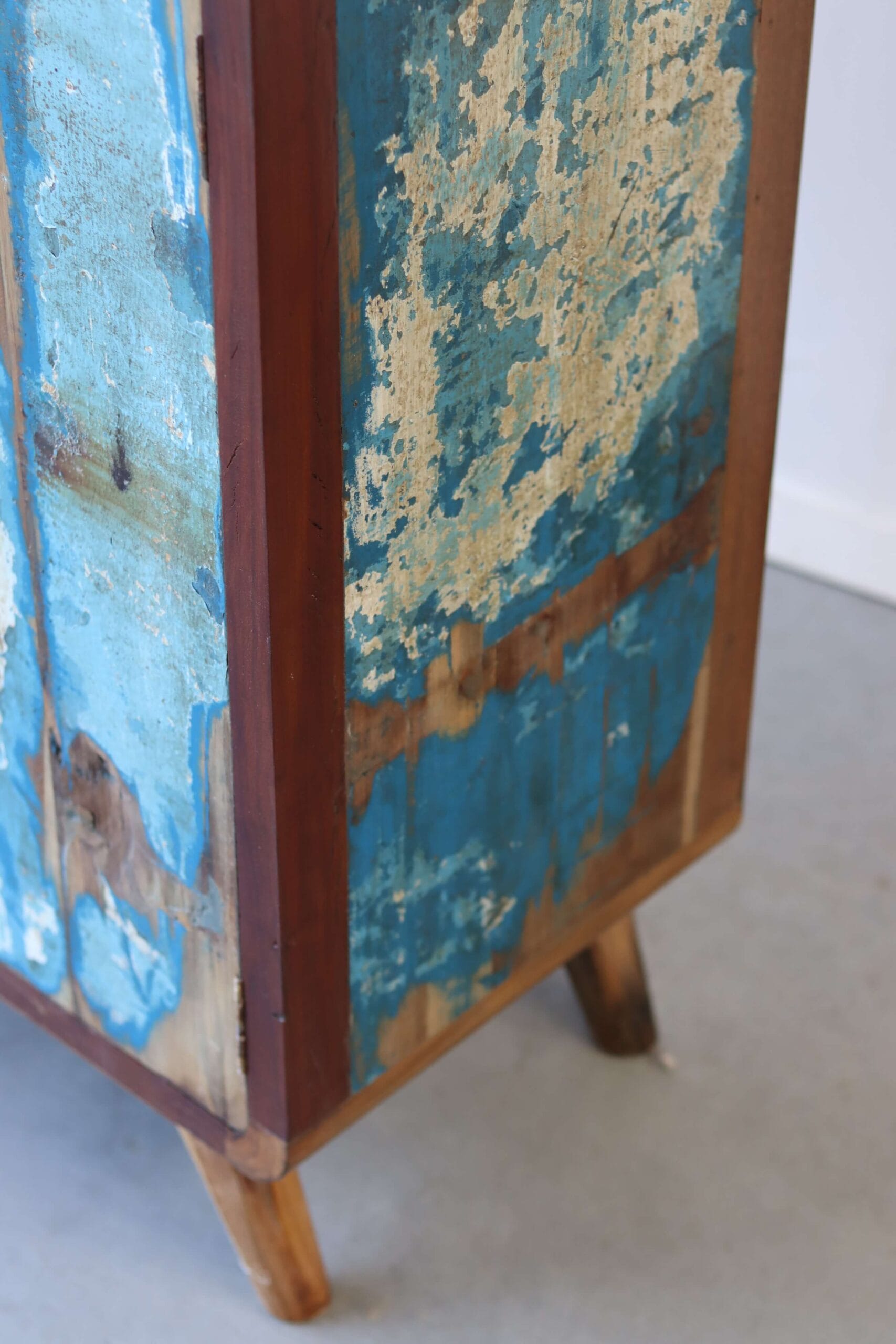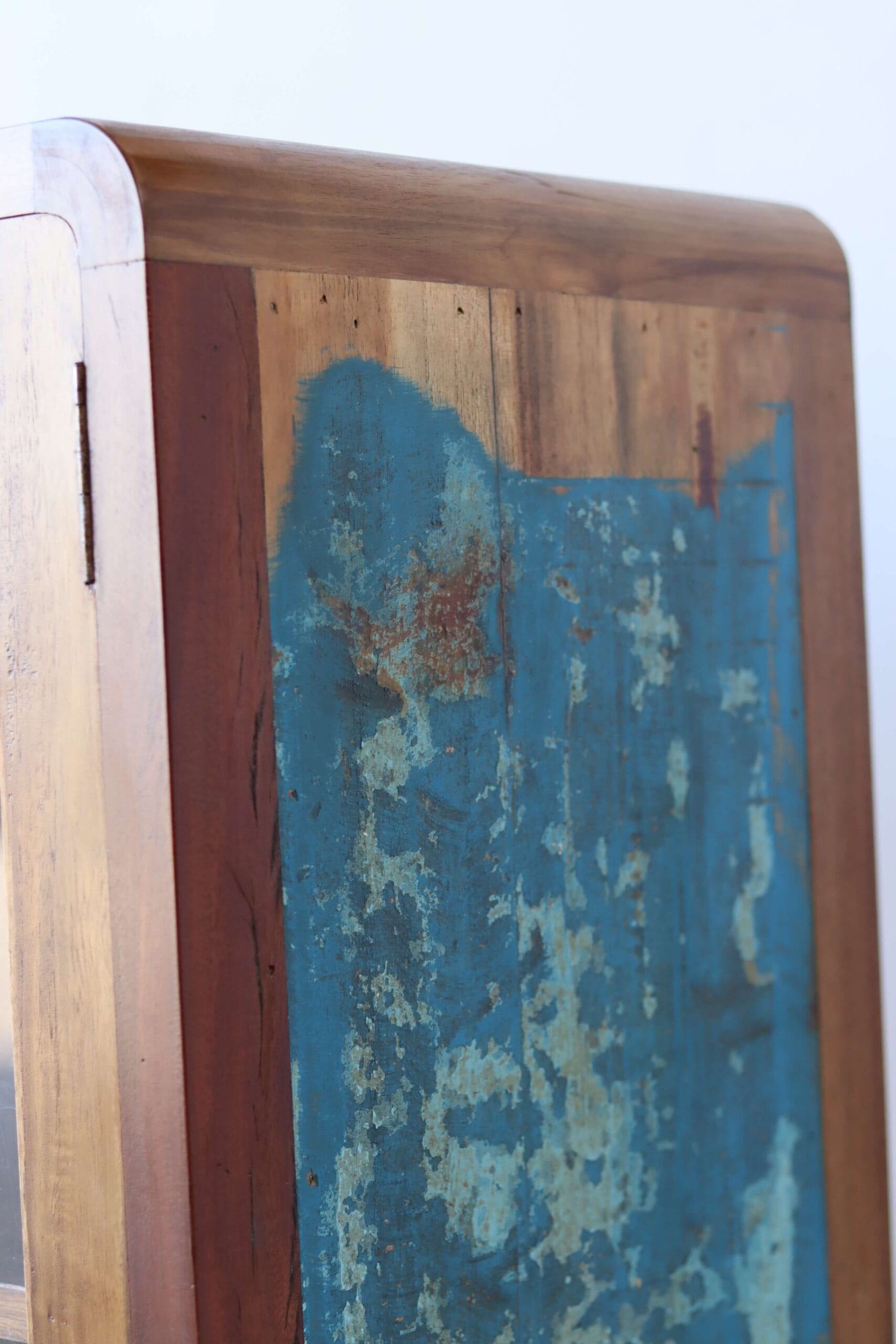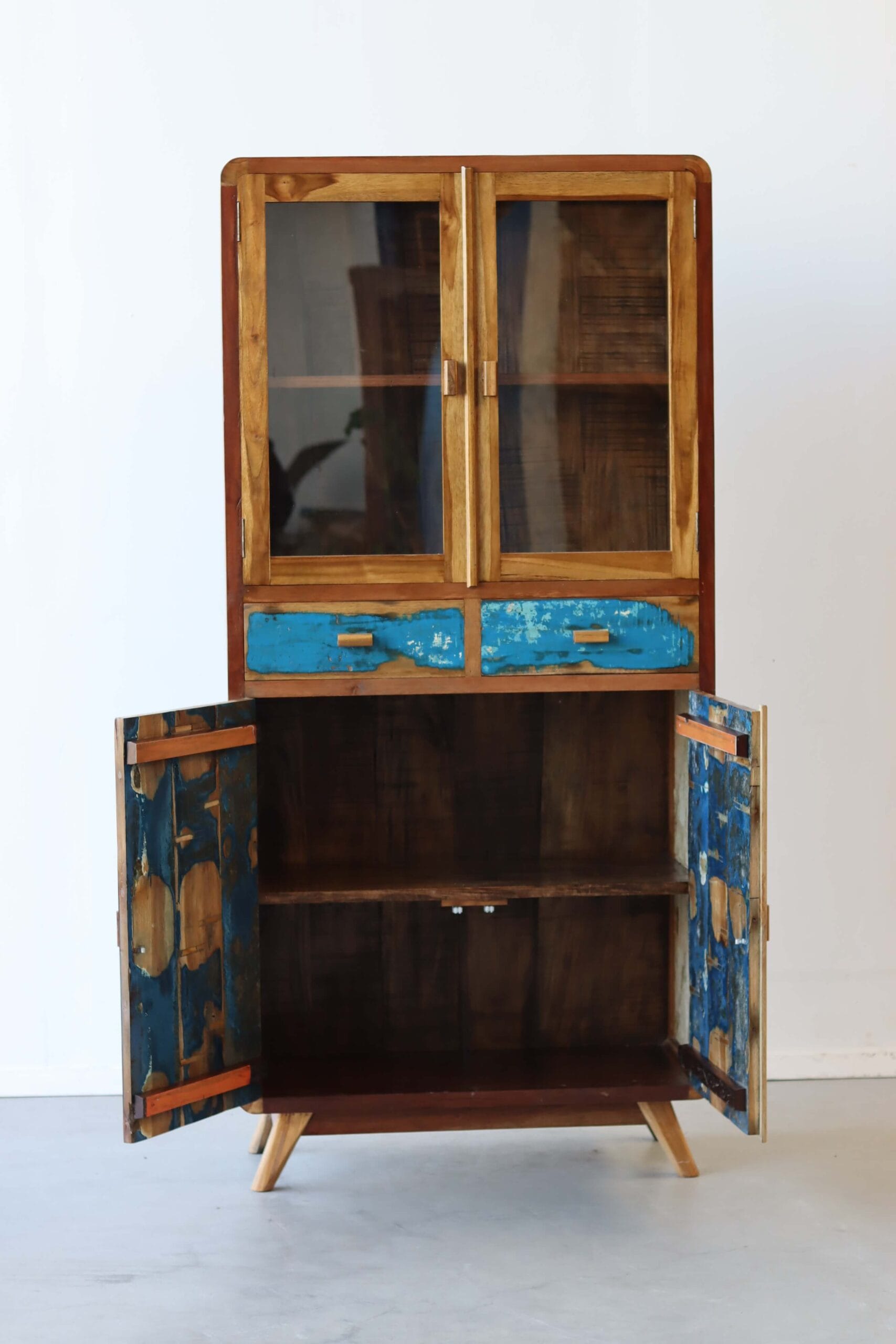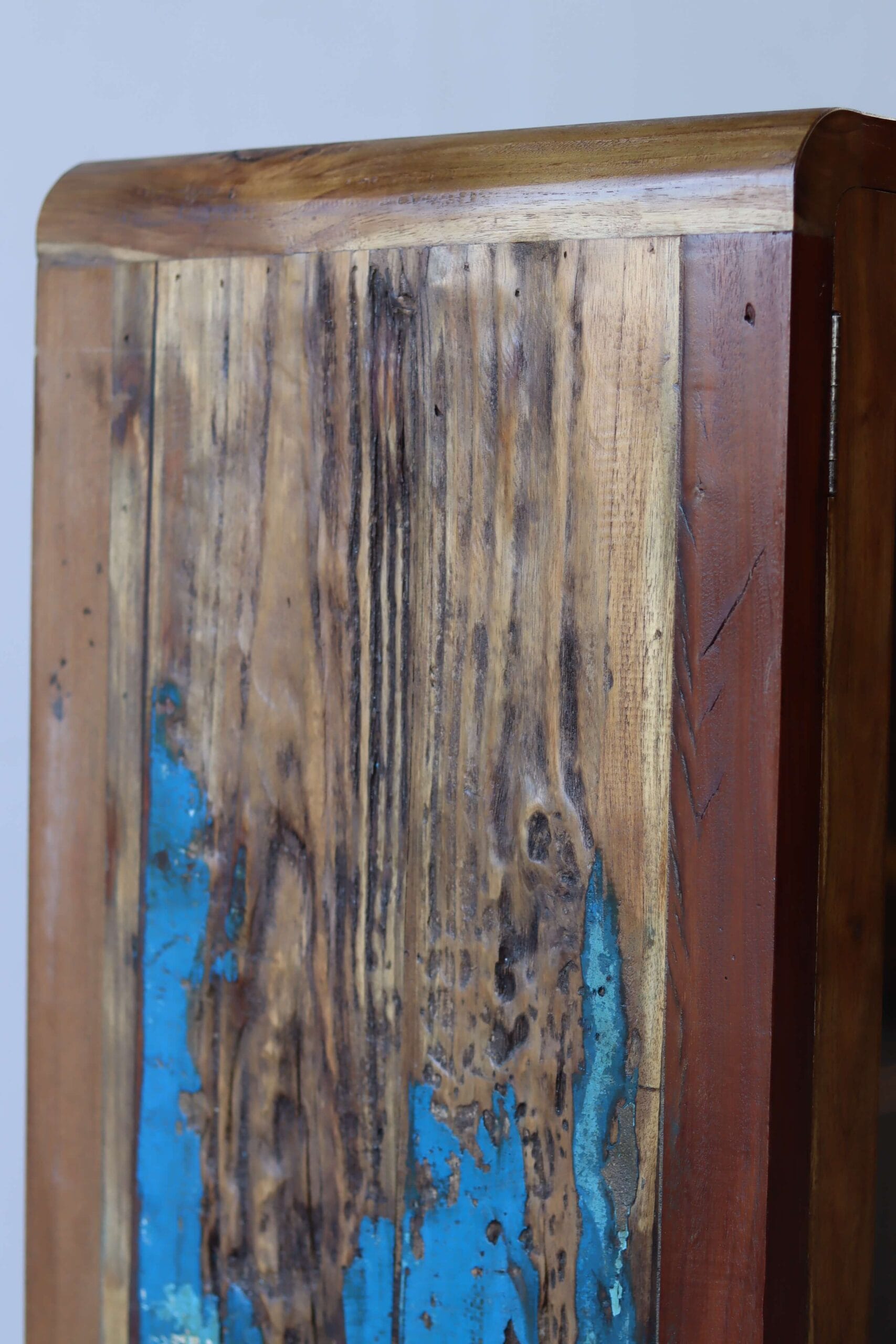 De originele verfresten van de bootjes maken elke kast uniek. Het hout is door de jaren gevormd door zon, zout en zee. Geen twee kasten zijn hetzelfde. Dit maakt de vitrinekast Canggu een echte blikvanger. Of je nu een industriële loft, een bohemian stadspand of een strandhuisgevoel wilt creëren, deze kast past overal.