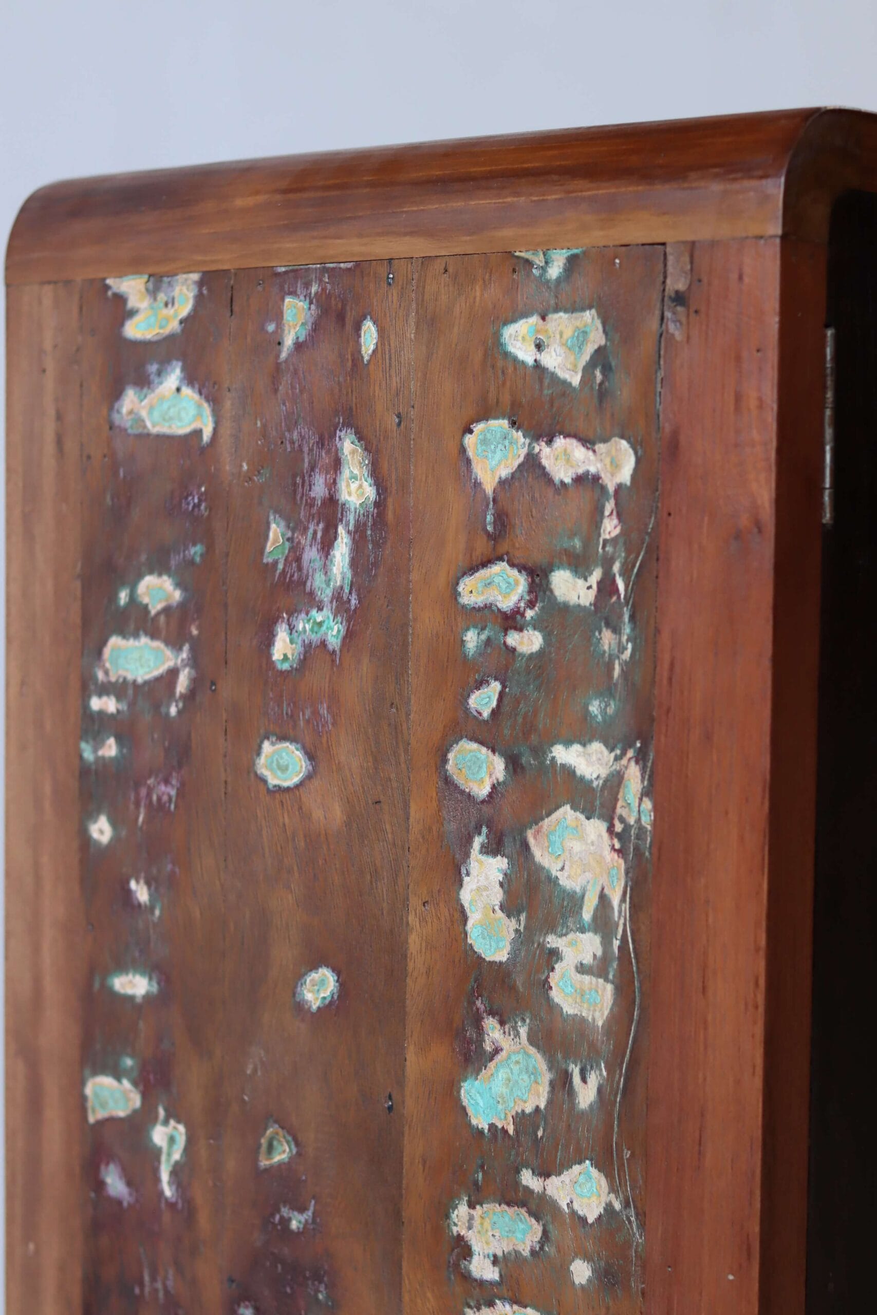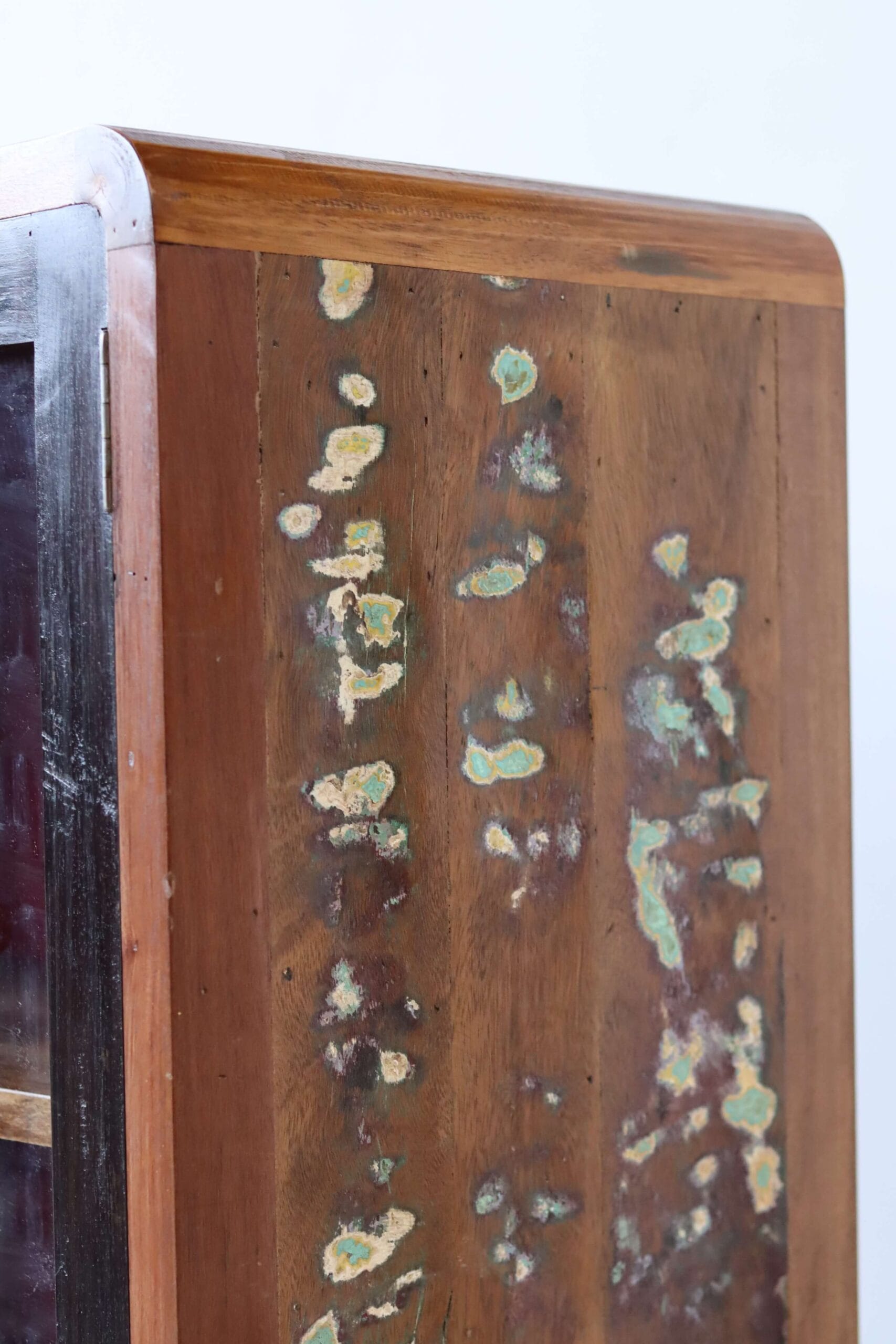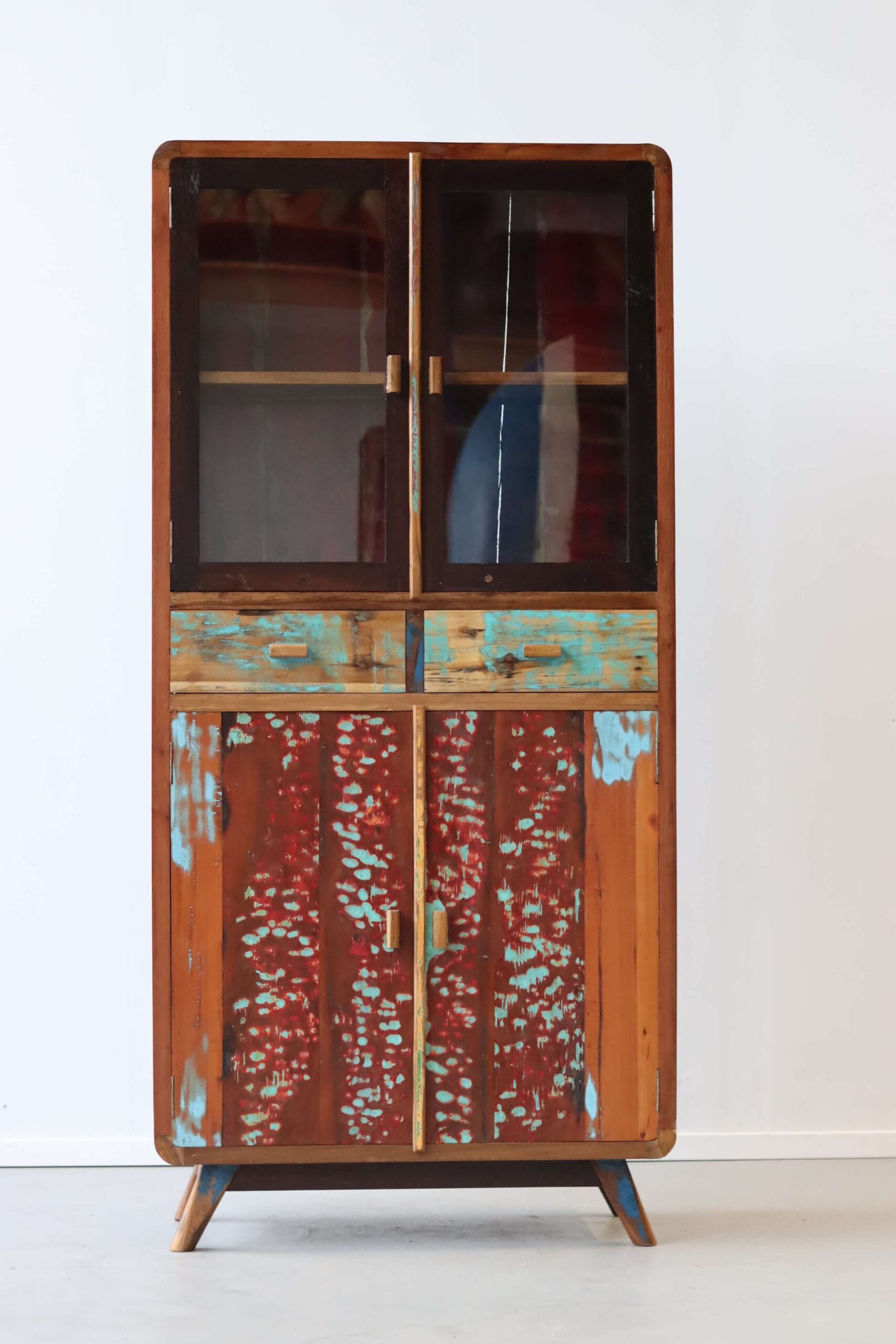 De Vitrinekast Boothout Naturel is een uniek meubelstuk dat sfeer en rust brengt in huis. Deze vitrinekast is gemaakt van authentiek boothout uit Indonesië, afkomstig van oude vissersboten die jarenlang de zeeën trotseerden. Waar veel boothout meubels nog vol kleur zitten, is bij dit model de meeste verf zorgvuldig weggeschuurd. Wat overblijft is de pure schoonheid van naturel hout, met hier en daar een subtiel verftintje als herinnering aan het verleden.