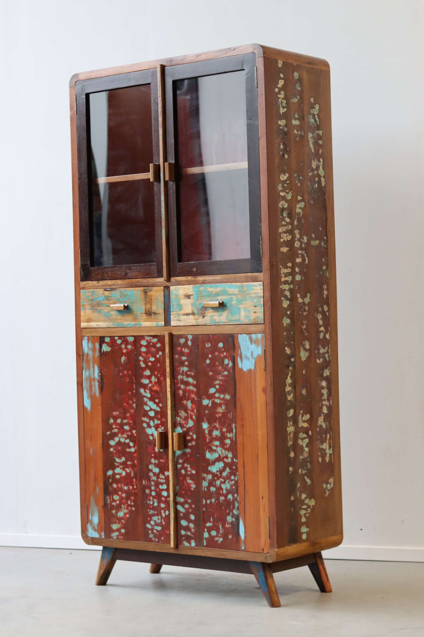 Elke vitrinekast van boothout is met de hand gemaakt in kleine werkplaatsen in Indonesië. Er wordt enkel gebruikgemaakt van massief hout – geen fineer of imitatie. Het gerecyclede boothout krijgt zo een tweede leven en draagt sporen van weer en wind, wat elke kast uniek maakt. Geen enkel exemplaar is hetzelfde.