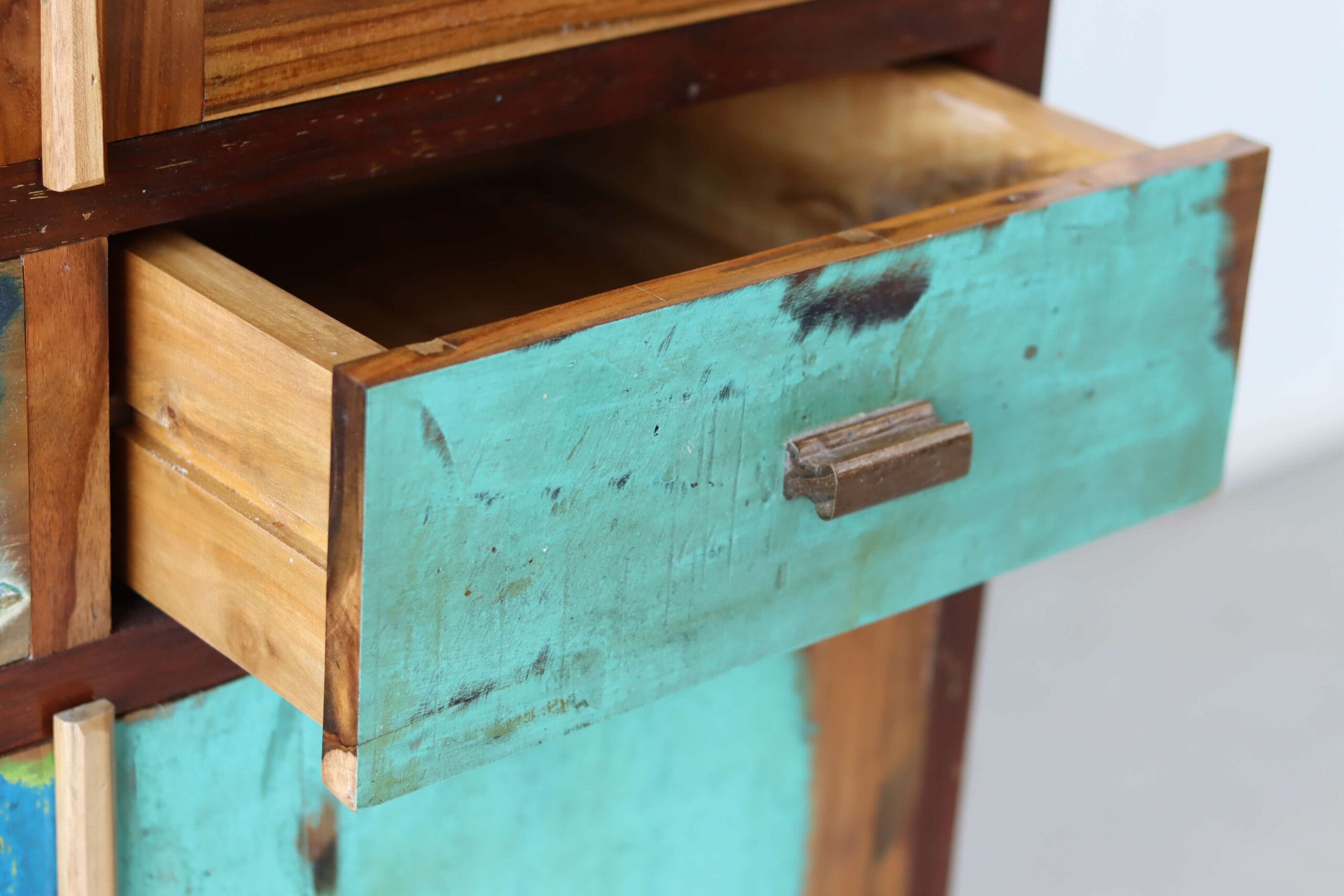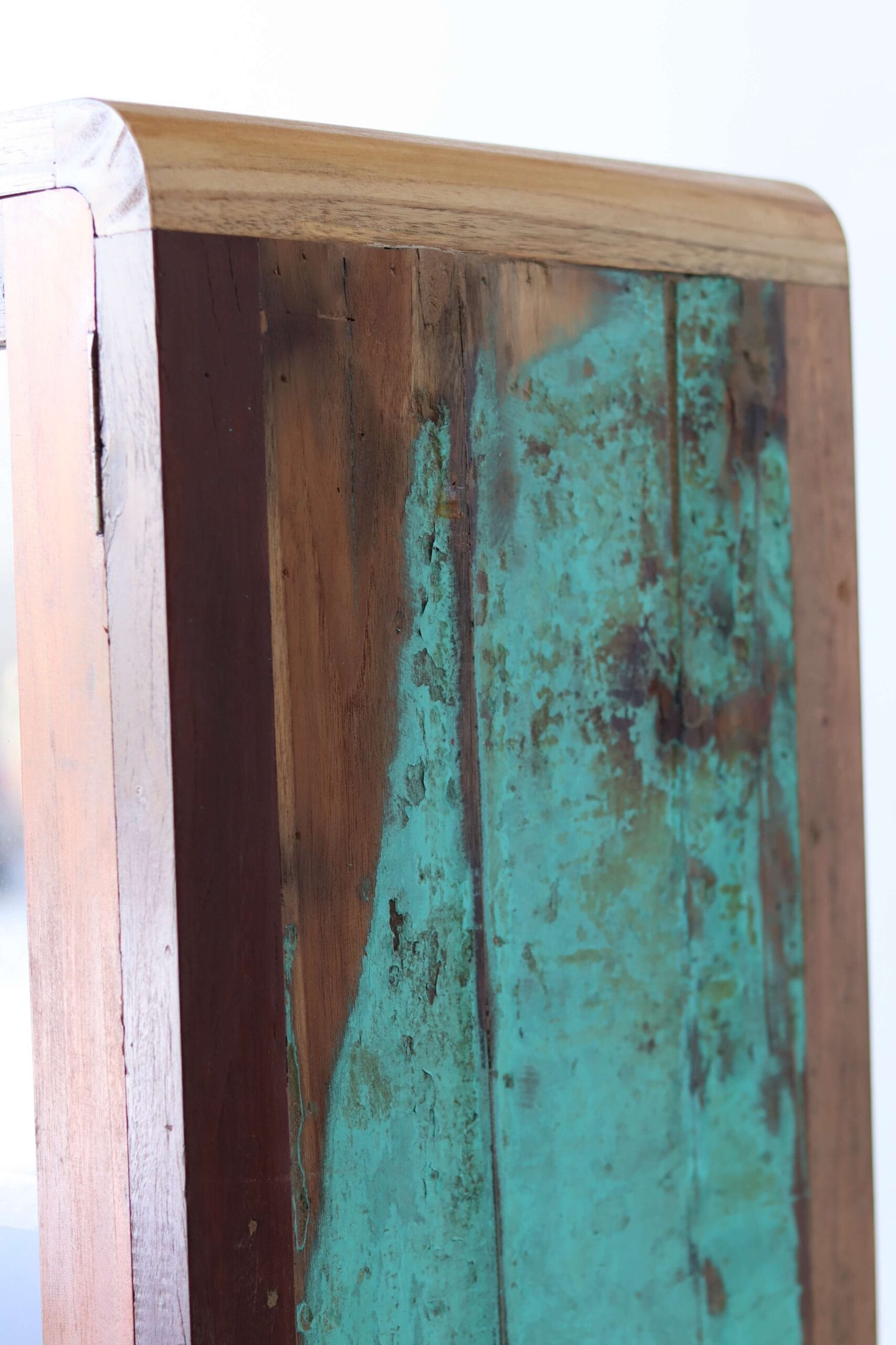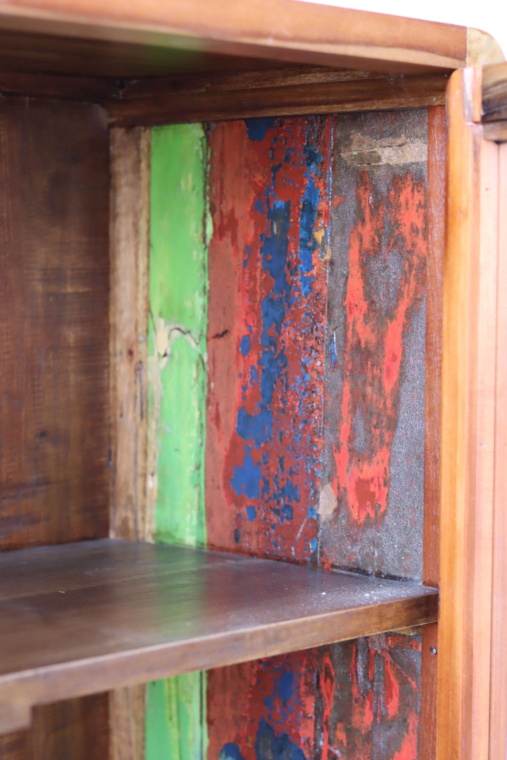 De kleurrijke vitrinekast Sumba is gemaakt van oud vissersboothout, precies zoals Daan dat op zijn reizen tegenkwam. De verweerde lagen verf — turquoise, oranje, geel en rood — vertellen het verhaal van zon, zee en tijd. Elke plank draagt sporen van de reizen die de bootjes maakten. Zo krijgt deze vitrinekast niet alleen kleur, maar ook karakter.